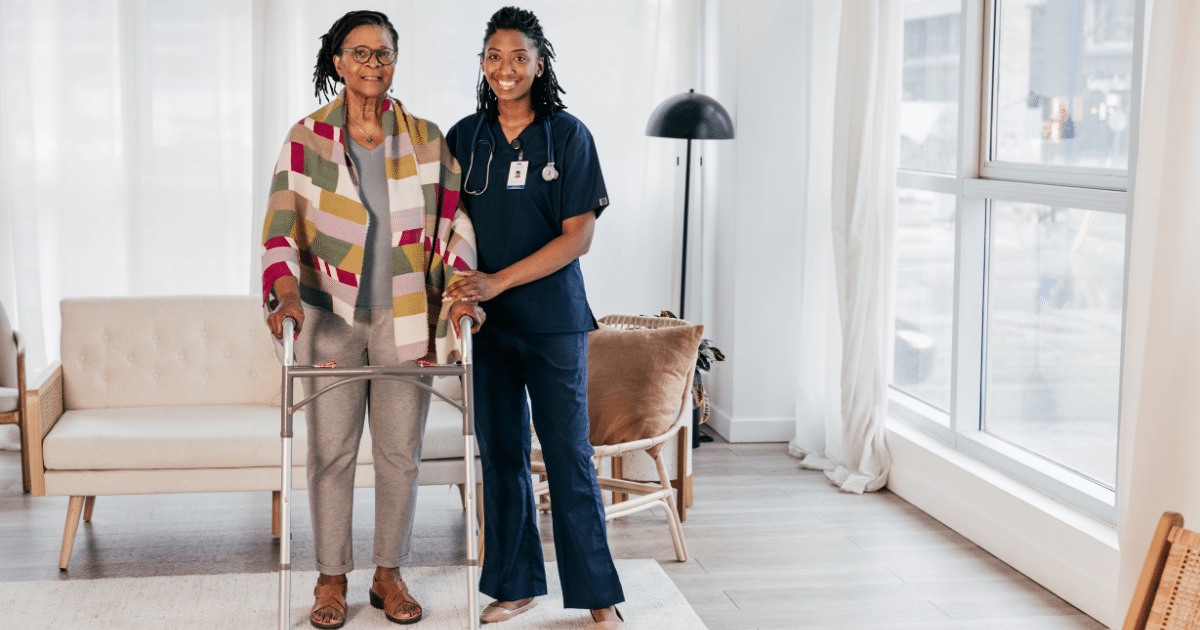 ![Image of New York City skyline with home care professional and senior client – ALT TEXT: Home care professional assisting senior client with Manhattan skyline in background]